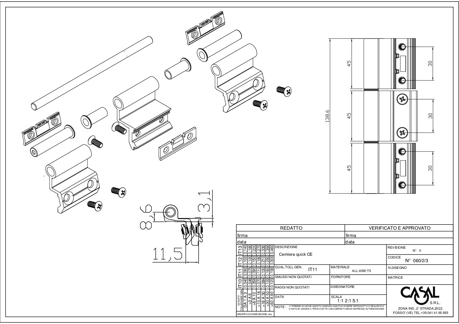 Balama Quik cu 3 aripi pentru fereastră cu simplă deschidere, 8,60mm distanța la ax, capacitate de susținere de 80kg / fereastră. Balamalele din gama Quik au fost proiectate și fabricate de Casal cu scopul reducerii timpilor de instalare. Placa și știftul de blocare din oțel inoxidabil, permit recuperarea toleranțelor între profile, facilitând asamblarea pe tocul ferestrei. Plăcile de fixare, știftul și șuruburile sunt fabricate din oțel inoxidabil garantând calitatea produsului.