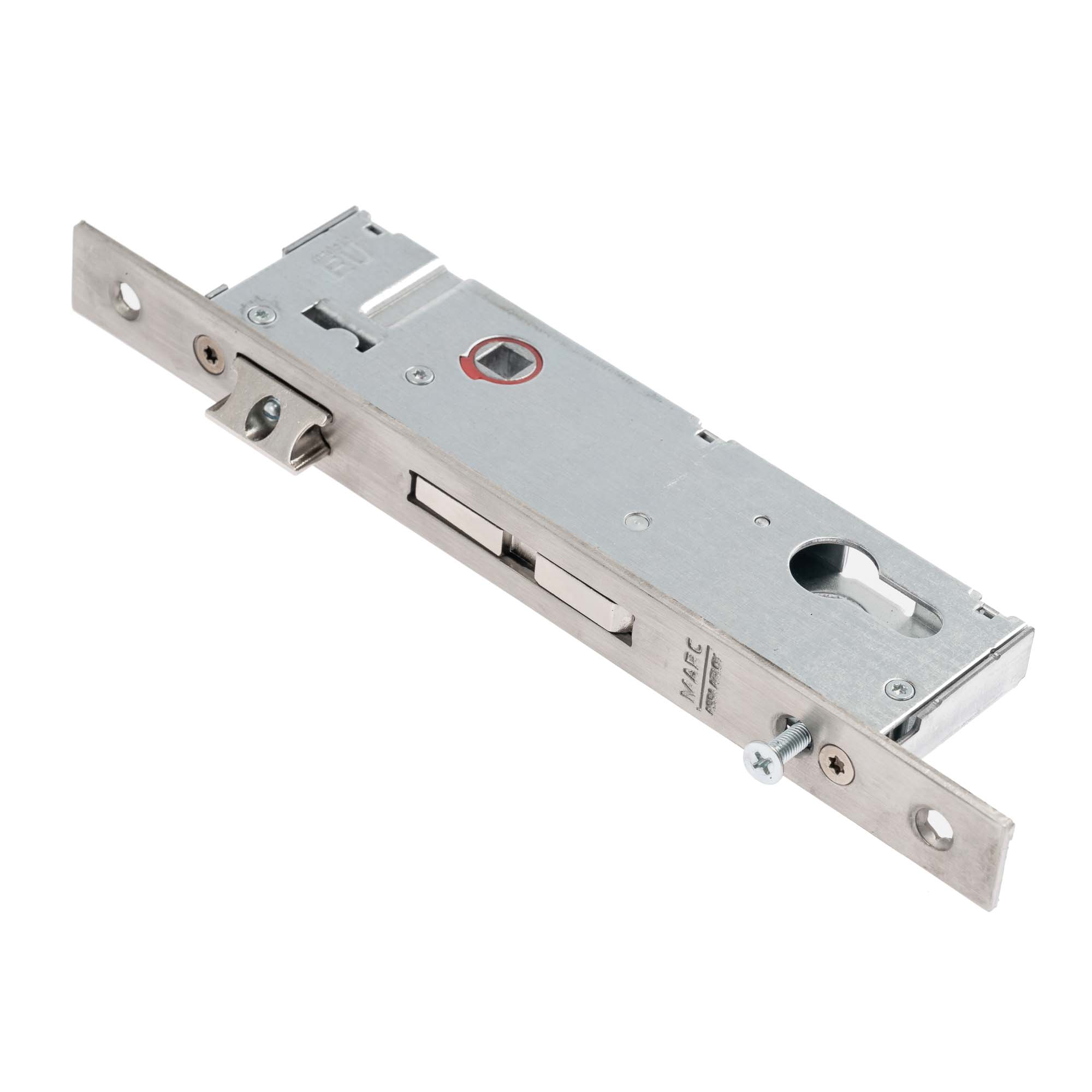 Broască cu limbă și zăvor basculant 1 punct, lățime placă frontală 22mm, lățime corp 15mm, interax 85mm, ax cilindru 35mm, limbă reversibilă, reglabilă și interschimbabilă cu rolă (accesoriu separat). Din oțel inox, configurată pentru cilindru european sagomat, conform normă EN 12209. Poate fi montată și pe profile din PVC.