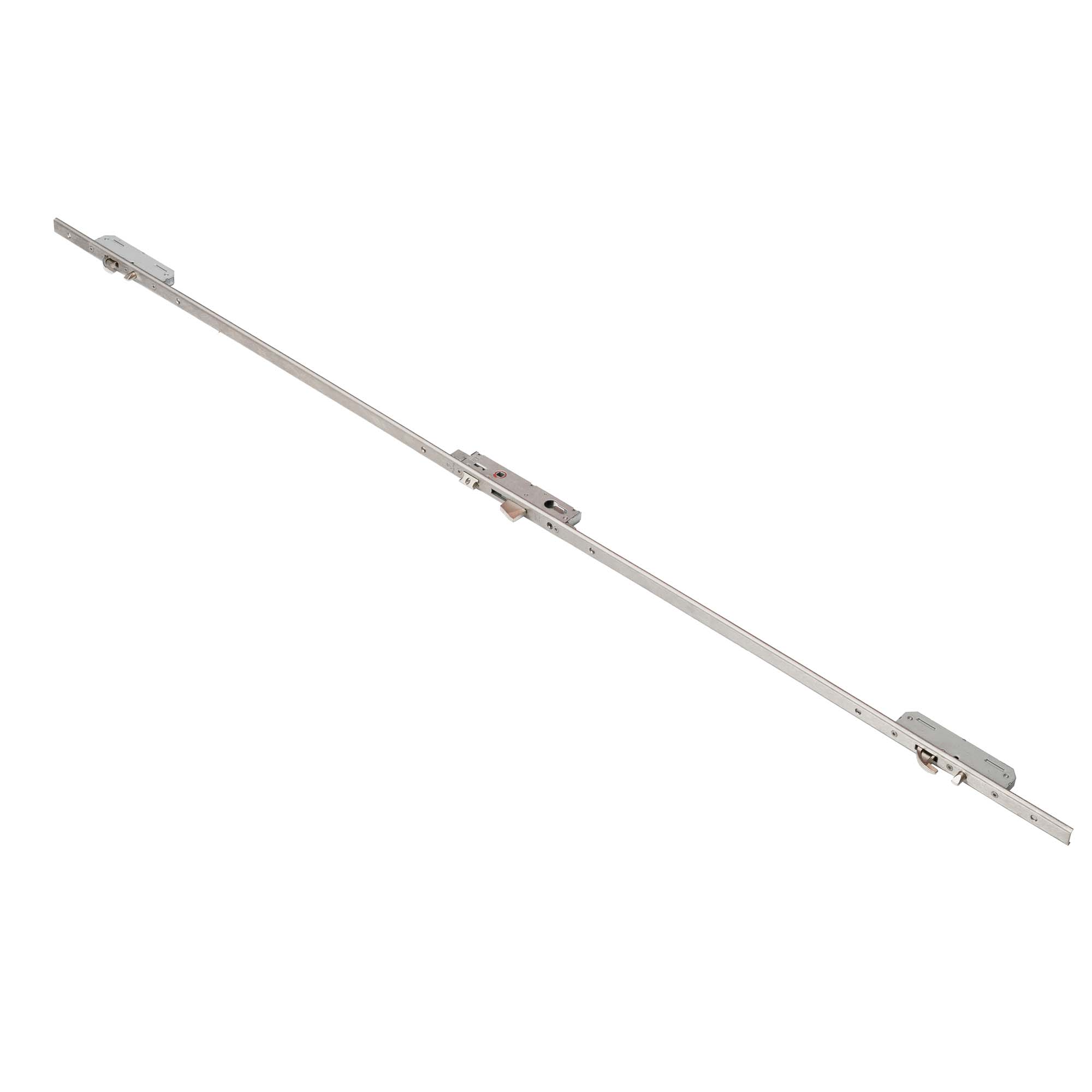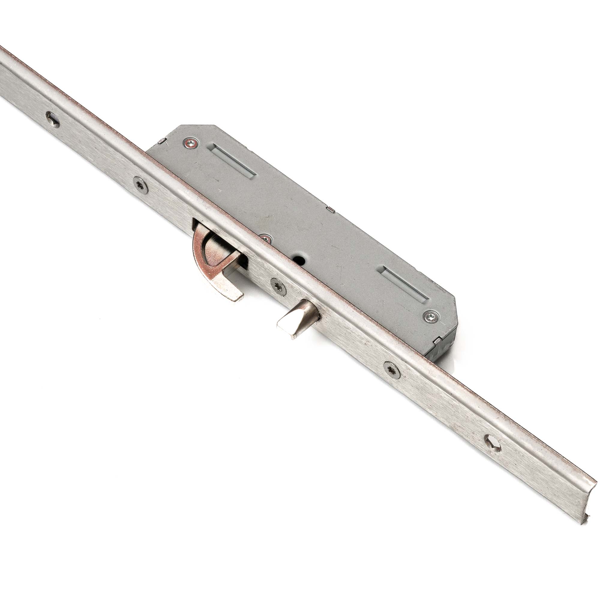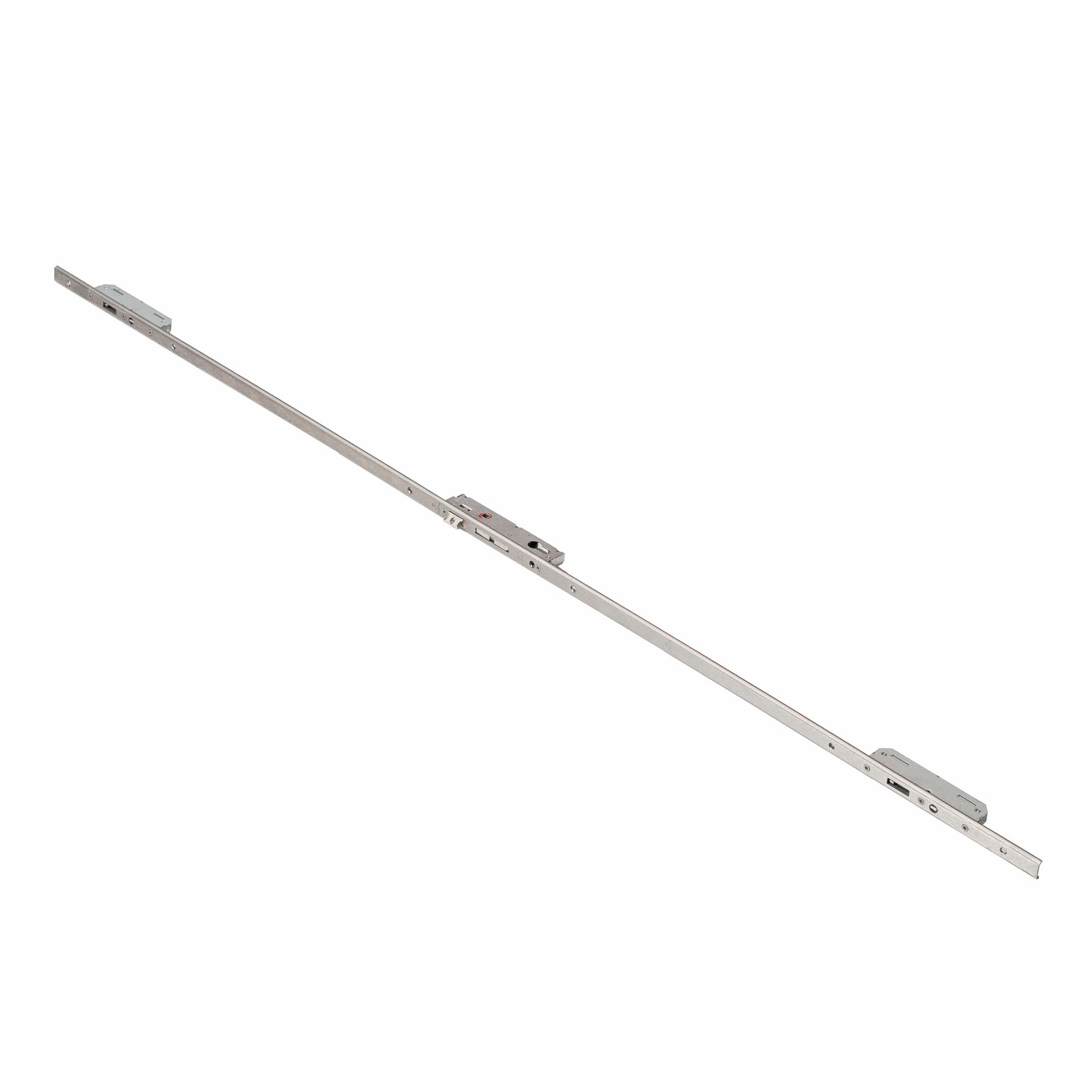 Broască cu limbă și zăvor basculant în 5 puncte de închidere: zăvor central, 2 zăvoare basculante agățătoare și două semi-zăvoare, lățime placă frontală 22mm – tip U, lățime corp 15mm, interax 85mm, ax cilindru 25mm, limbă reversibilă și reglabilă din oțel inox, înălțime 1700mm, configurată pentru cilindru european sagomat, de siguranță conform norma EN 15685.Poate fi montată și pe profile din PVC.