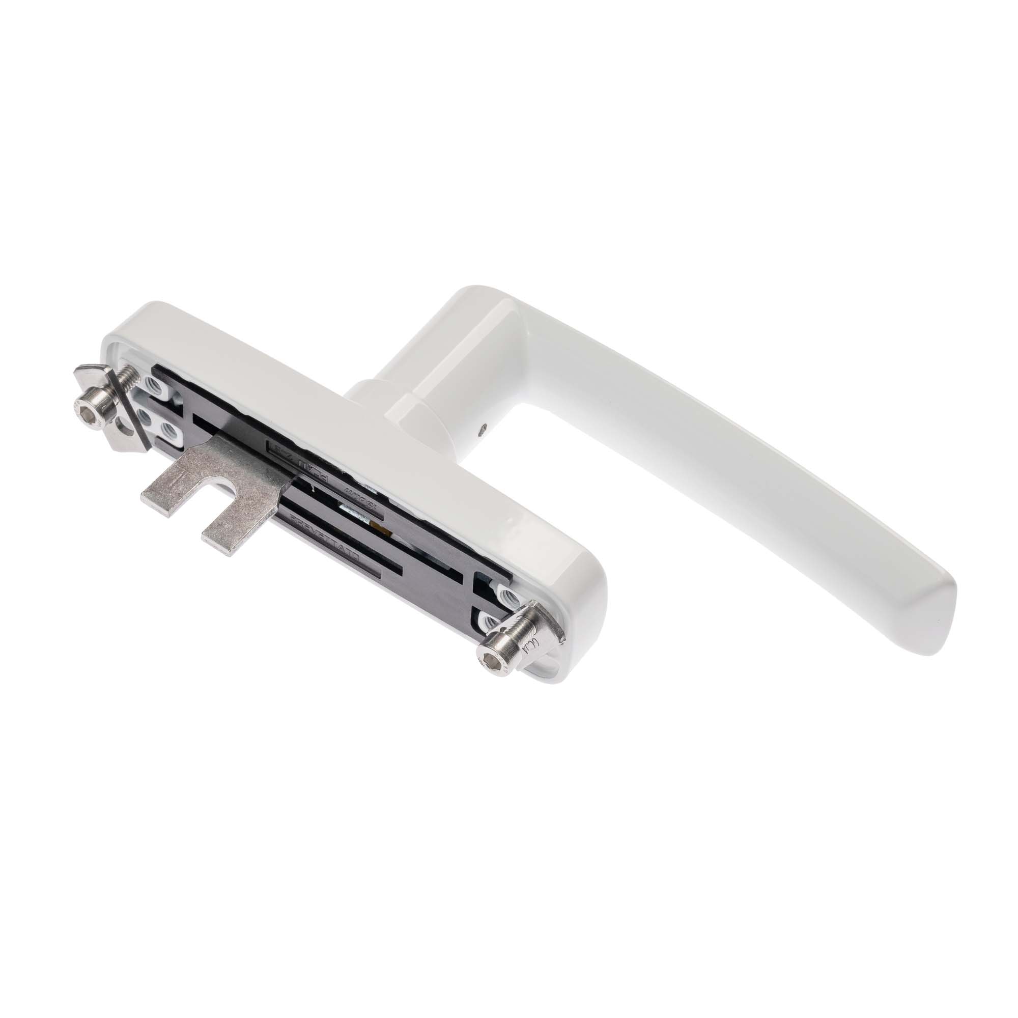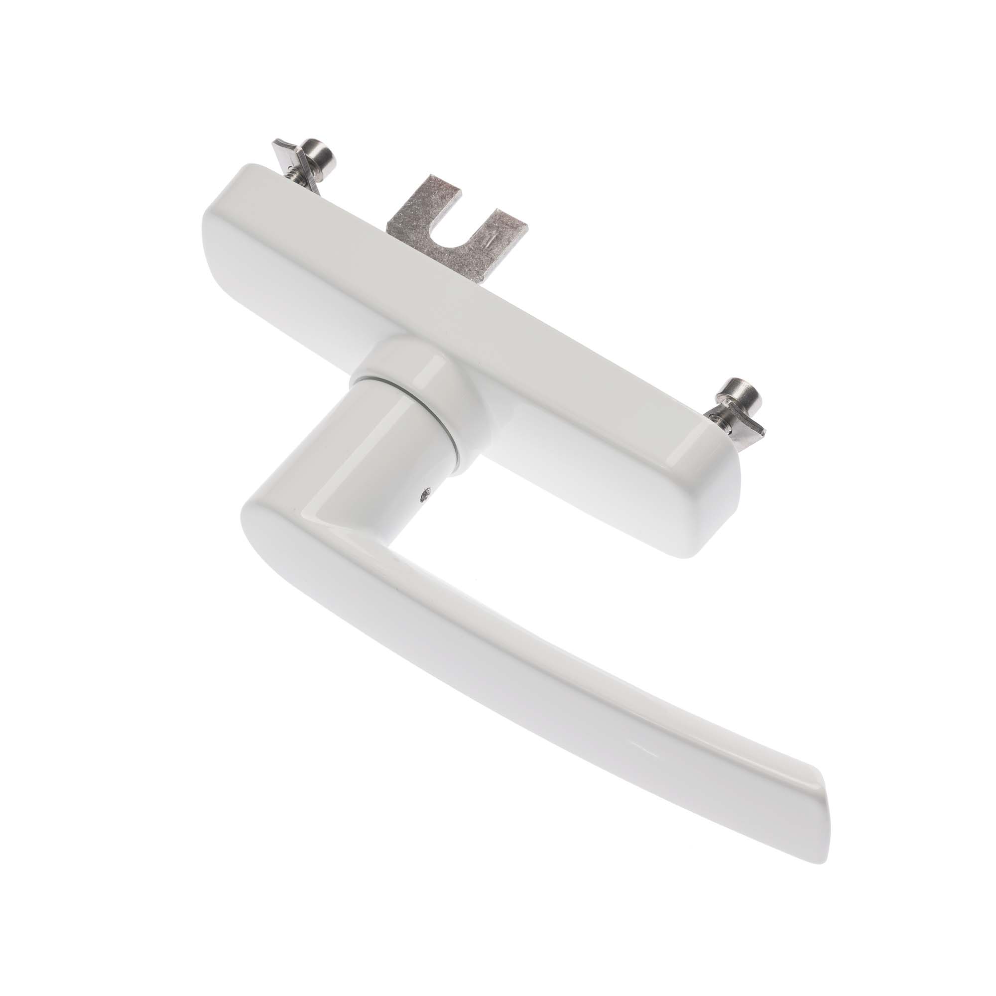 Cremon cu o singură furcă pentru fereastră cu dublă deschidere, alb lucios, interax prindere 84, 92, 98, 104 mm, reversibil