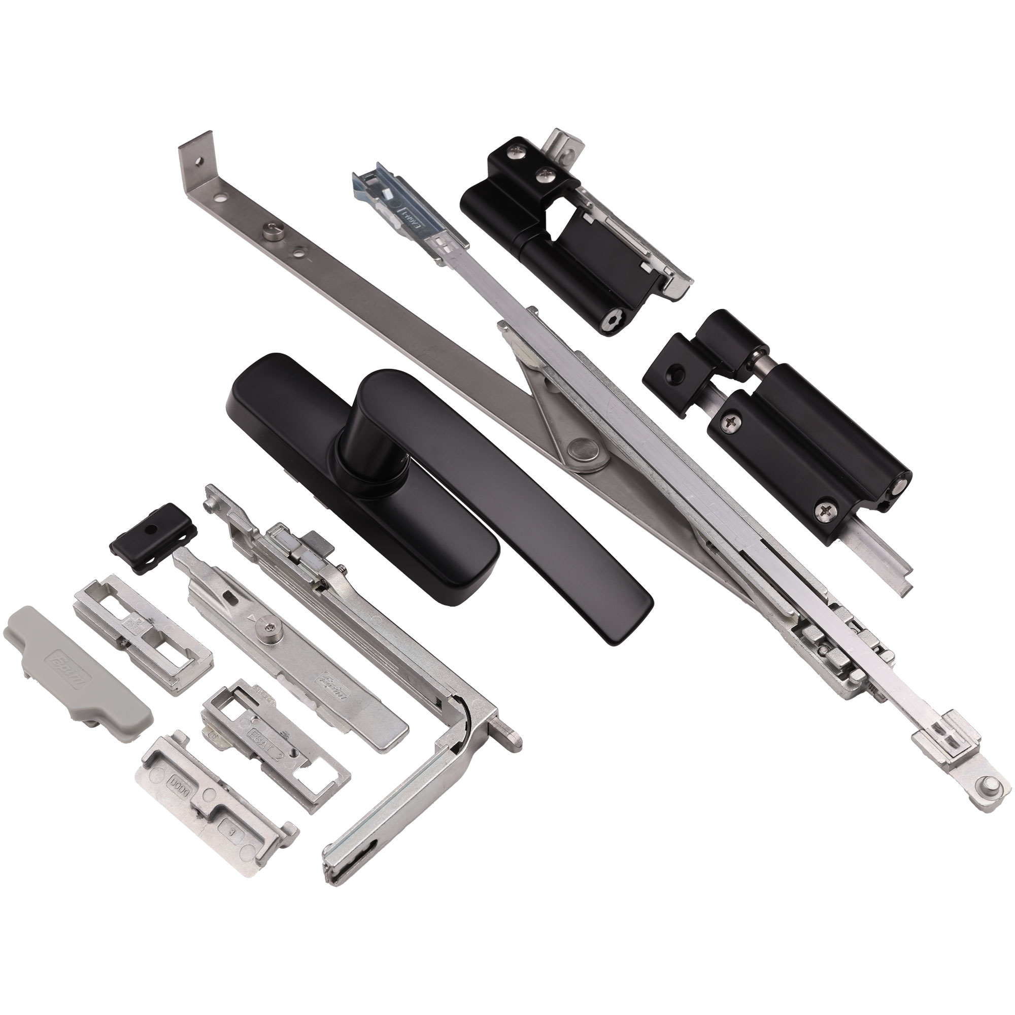 Set GALICUBE 150 cu accesorii negre, pentru fereastră cu dublă deschidere 1 canat, cu cremon, pereche balamale reversibile 150kg, braț mediu pentru lățime de la 562mm până la 1200mm, colțar transmitere, cameră europeană 21mm