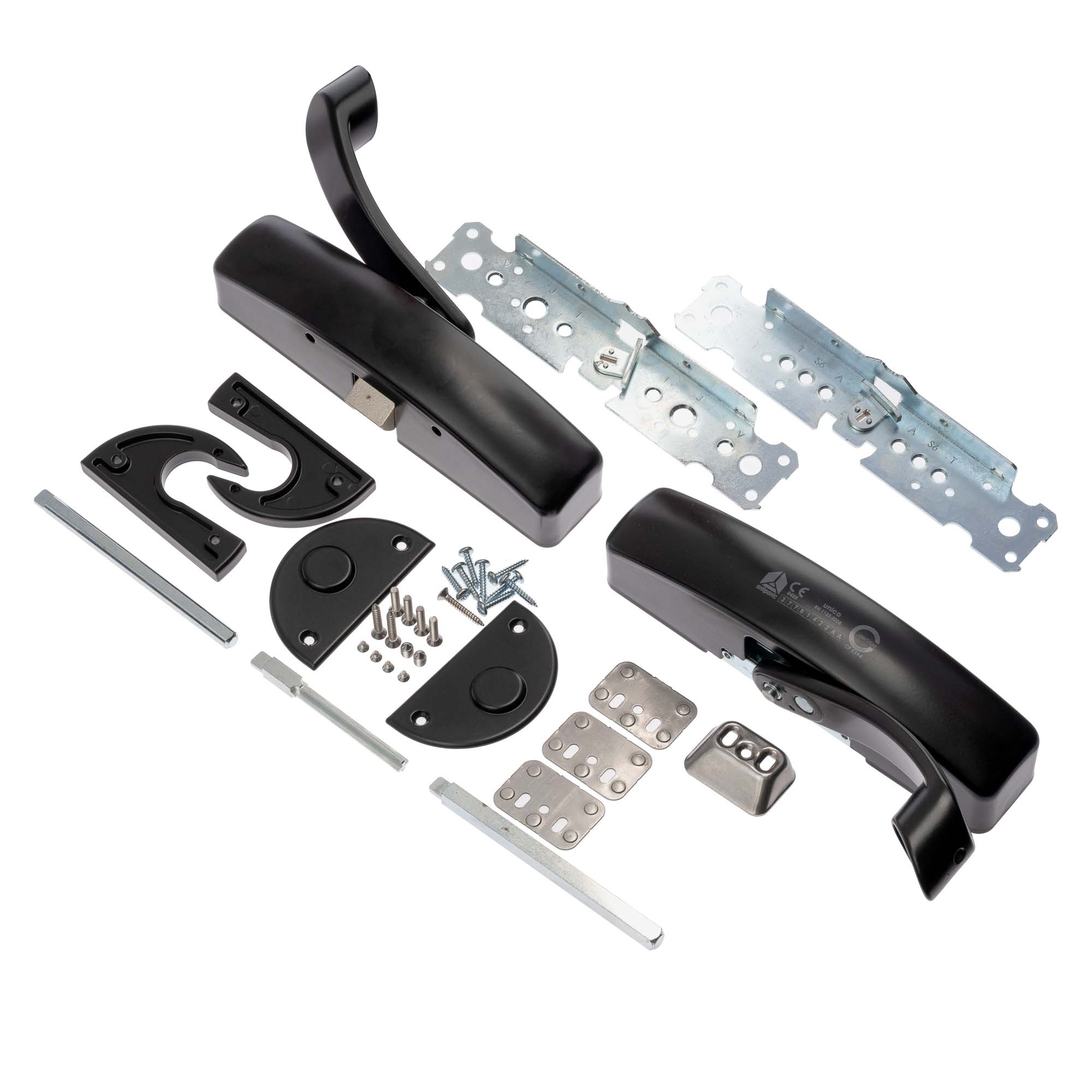 Kit de închidere antipanică ce poate înlocui majoritatea sistemelor antipanică existente în piață. Ideal pentru zona de mentenanță. Practic sistemul poate fi montat pe un canat pe care a fost montat deja un alt sistem. Conține 2 plăci metalice ce asigură fixări noi pe foaia de ușă, iar la final, toate fixările de la sistemul precedent, sunt acoperite.